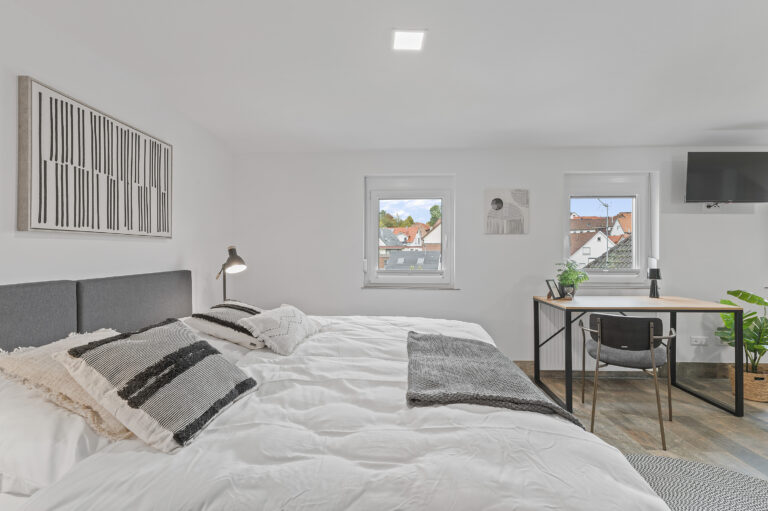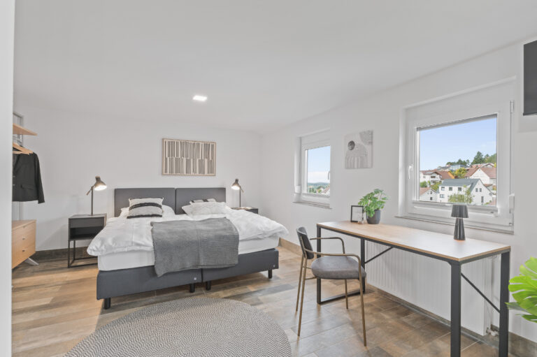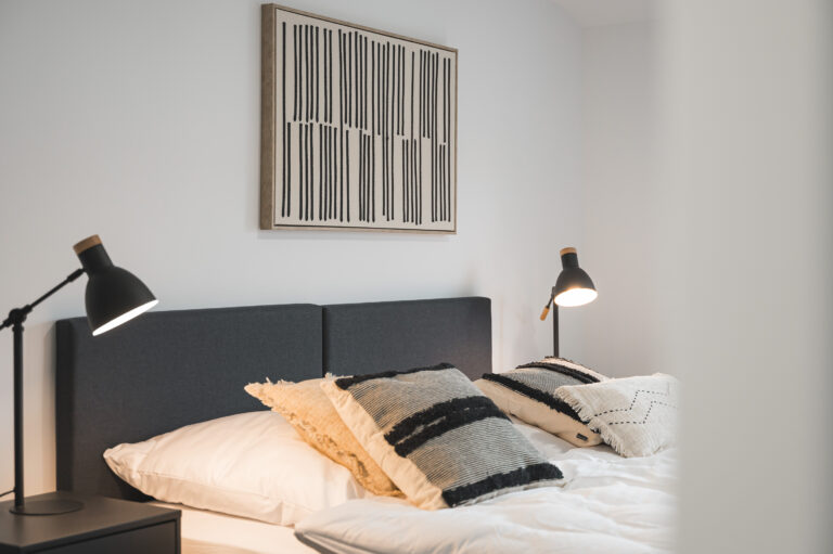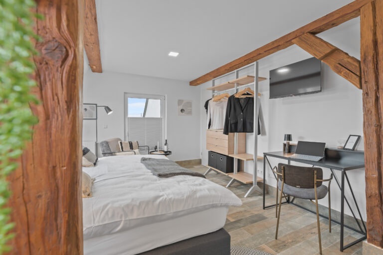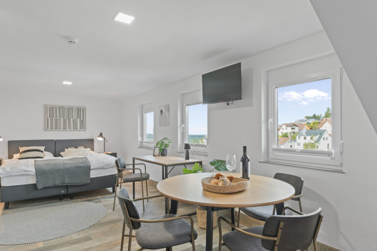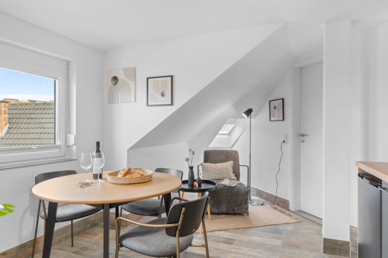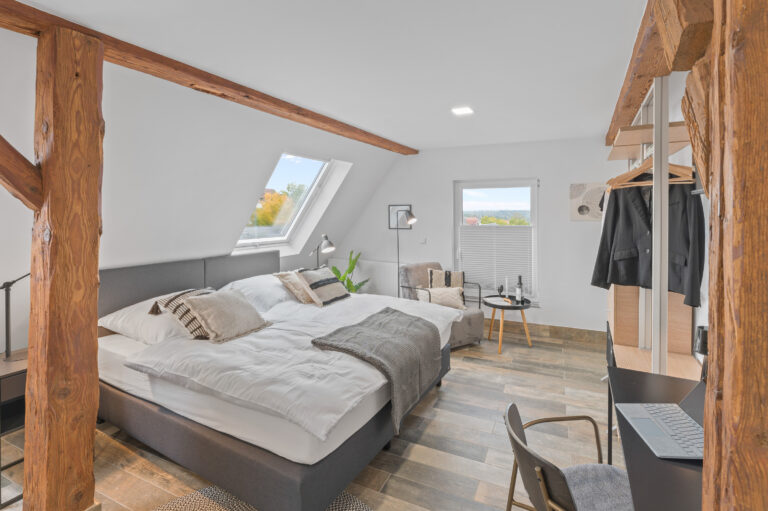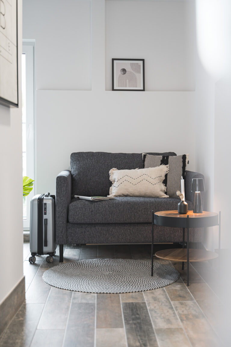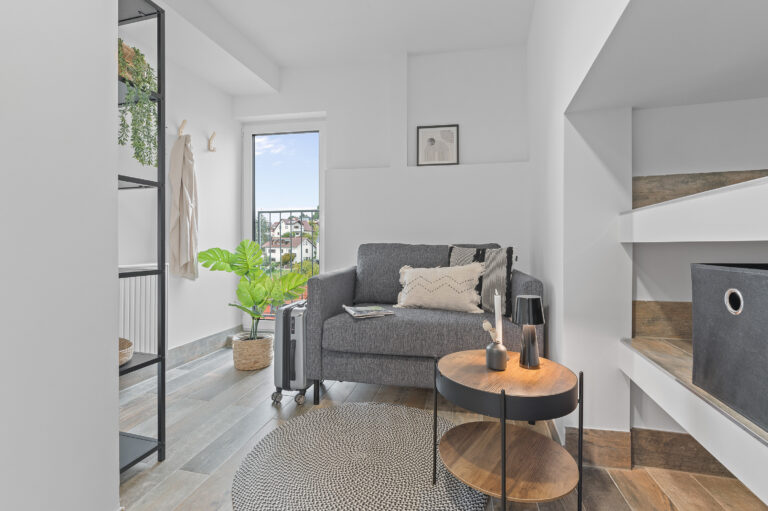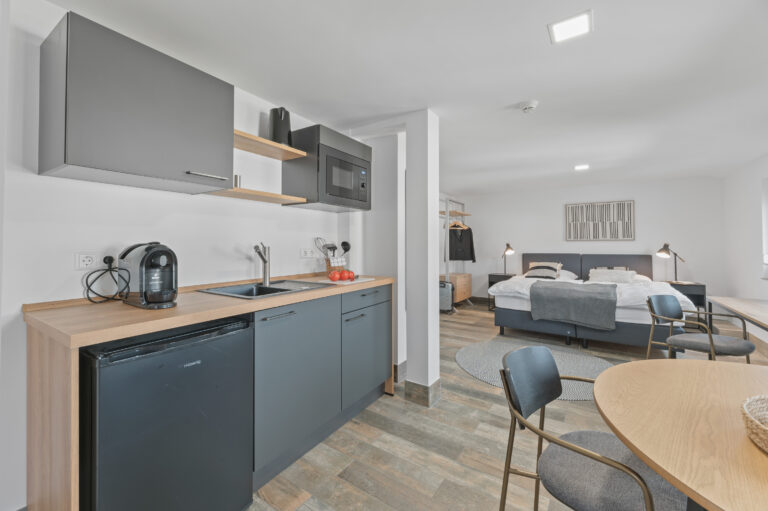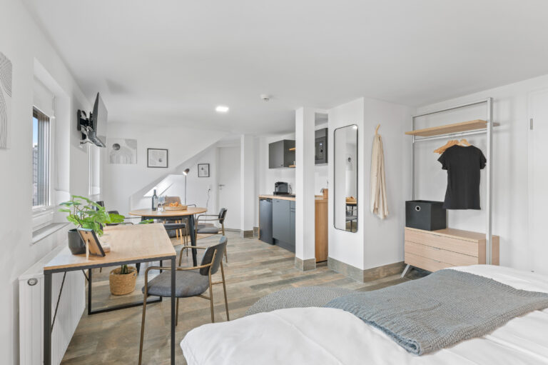Entdecken Sie unsere großzügigen 28m² Apartments im industrial Stil, die Platz für bis zu drei Erwachsene bieten.