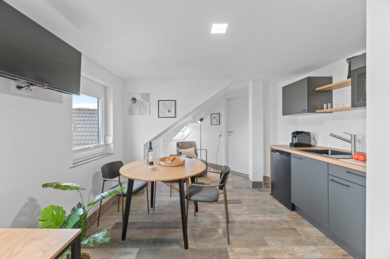 Die voll ausgestattete Küche mit Spüle, Herd, Backofen/Mikrowelle, Kühlschrank, Kaffeemaschine und Wasserkocher ermöglicht es Ihnen, Ihre Mahlzeiten nach Ihren Wünschen zuzubereiten. Der zusätzliche Esstisch lädt zum gemeinsamen Essen ein, während der komfortable Sessel mit Leselampe einen perfekten Rückzugsort für erholsame Stunden bietet. Die industriellen Details und die hochwertige Ausstattung machen Ihren Aufenthalt zu einem unvergesslichen Erlebnis inmitten eines modernen und trendigen Ambientes, das Ihre Sinne anspricht und Ihre Erwartungen übertrifft.