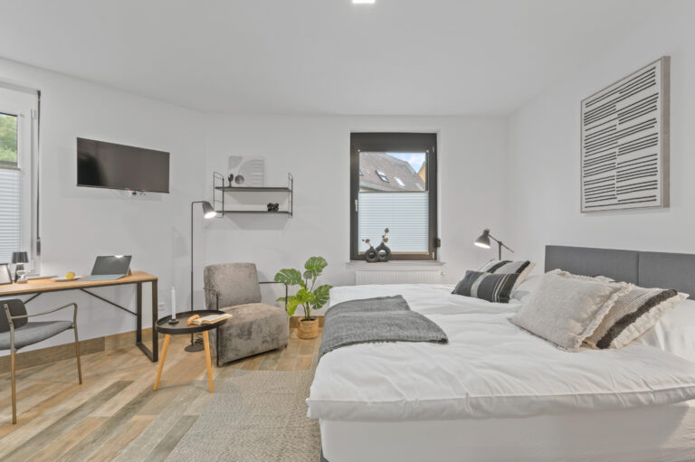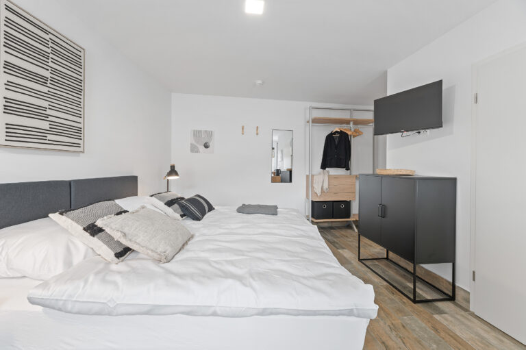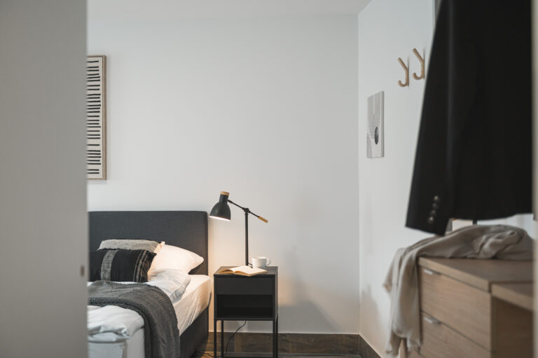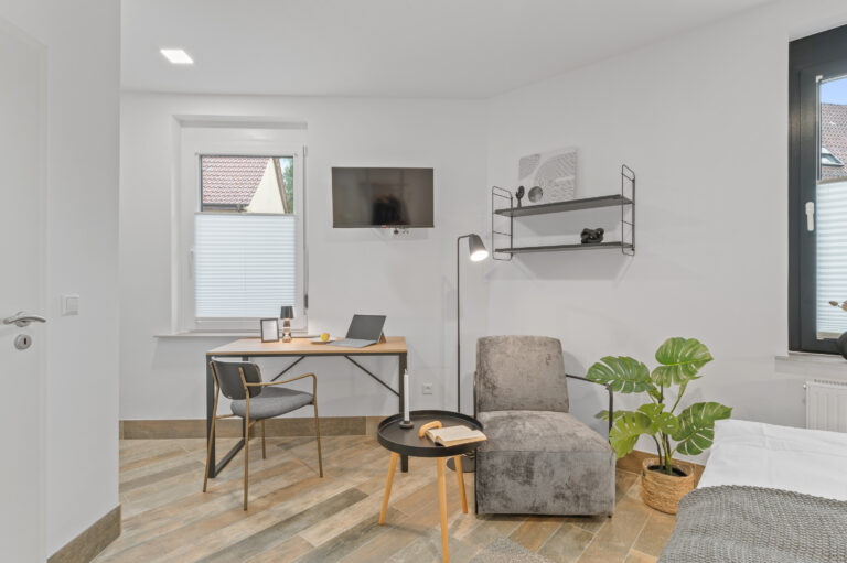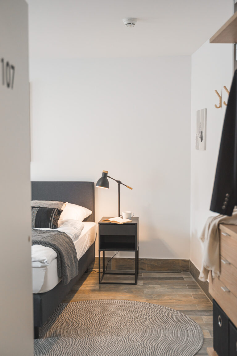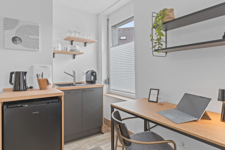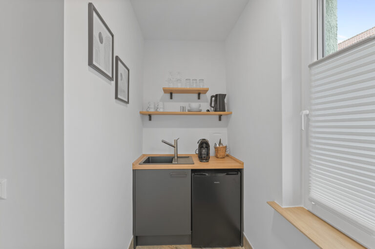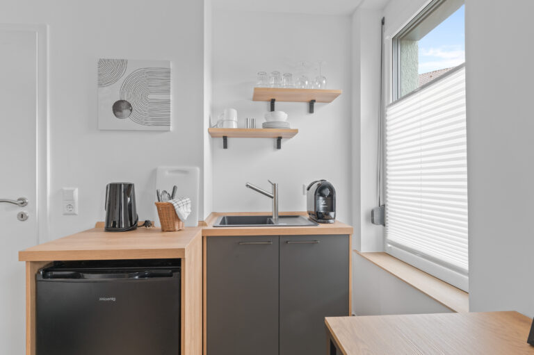 Die Pantryküche mit Kühlschrank, Kaffeemaschine, Wasserkocher und teilweise Spüle ermöglicht es Ihnen, Ihre Lieblingsgerichte zuzubereiten. Der gemütliche Lesesessel und der Beistelltisch bieten einen idealen Ort zum Entspannen und Genießen Ihrer Freizeit. Die industriellen Elemente, wie Möbel aus Metall und industrielles Design, verleihen dem Raum einen modernen und urbanen Charme, der Ihren Aufenthalt zeitgemäß entspannt gestaltet.