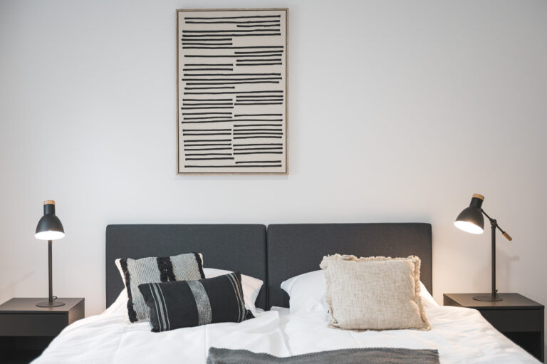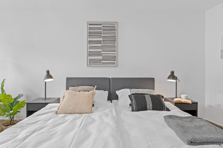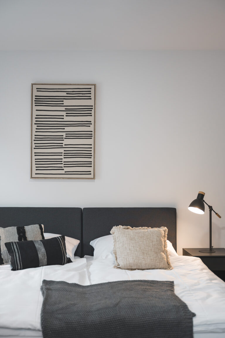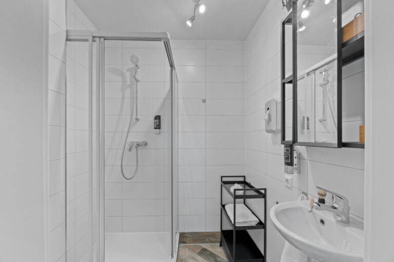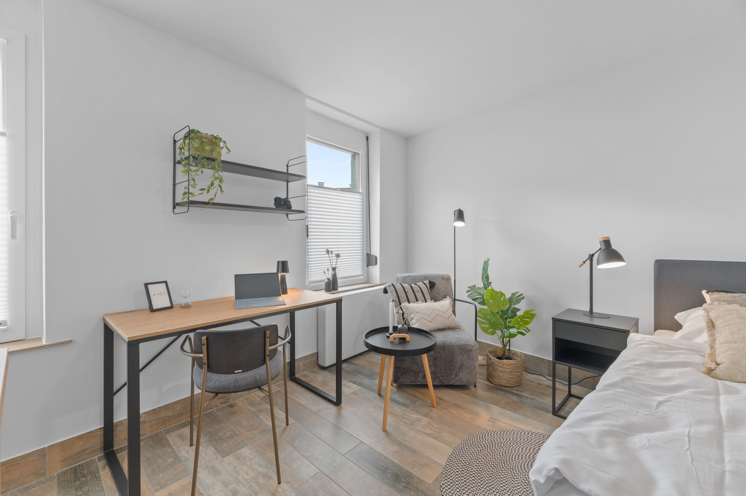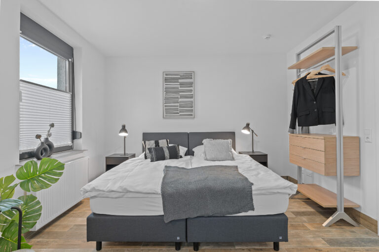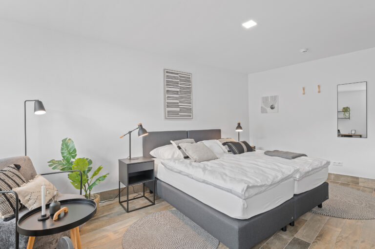 Die Pantryküche mit Kühlschrank, Kaffeemaschine, Wasserkocher und teilweise Spüle ermöglicht es Ihnen, Ihre Lieblingsgerichte zuzubereiten. Der gemütliche Lesesessel und der Beistelltisch bieten einen idealen Ort zum Entspannen und Genießen Ihrer Freizeit. Die industriellen Elemente, wie Möbel aus Metall und industrielles Design, verleihen dem Raum einen modernen und urbanen Charme, der Ihren Aufenthalt zeitgemäß entspannt gestaltet.